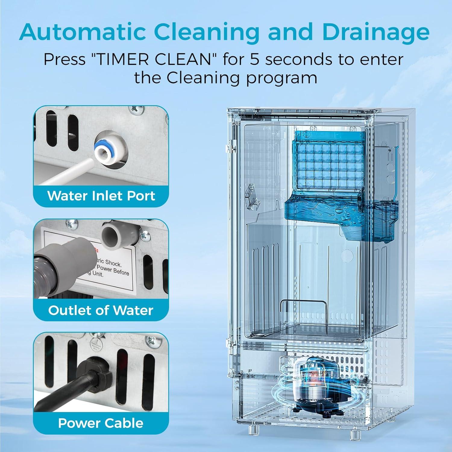 【Multifunctional Control Panel】 The commercial ice maker is fitted with an intelligent LCD panel. All functions and operations can be managed through the control panel. It displays the ambient temperature as a reminder to maintain the surrounding temperature for efficient ice-making. The Cowsar commercial ice maker features a 24-hour timer function, allowing you to set the times for the machine to turn on or off. This under-counter ice maker will initiate a self-cleaning cycle by pressing the “Timer Clean” button on the LCD screen for 5 seconds.