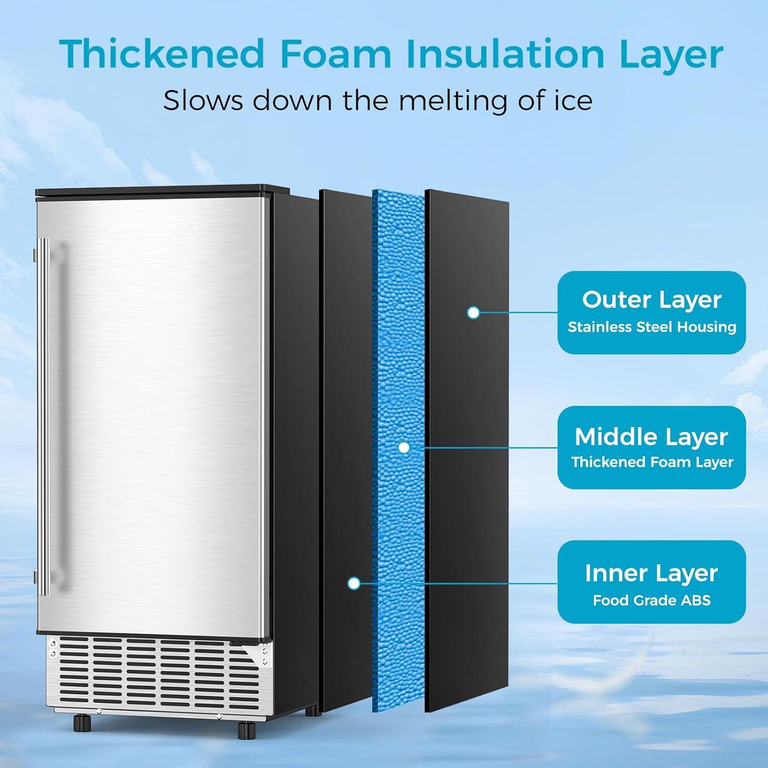 【Insulation and Adjustable Ice Thickness】 The outer shell, made from three layers of material, preserves the shape of the ice for extended periods, preventing melting. You can adjust the ice-making time to achieve ice cubes with varying degrees of surface indentation. A high-quality evaporator can produce 40 connected ice cubes simultaneously, easily separated into individual cubes with the included ice scoop.