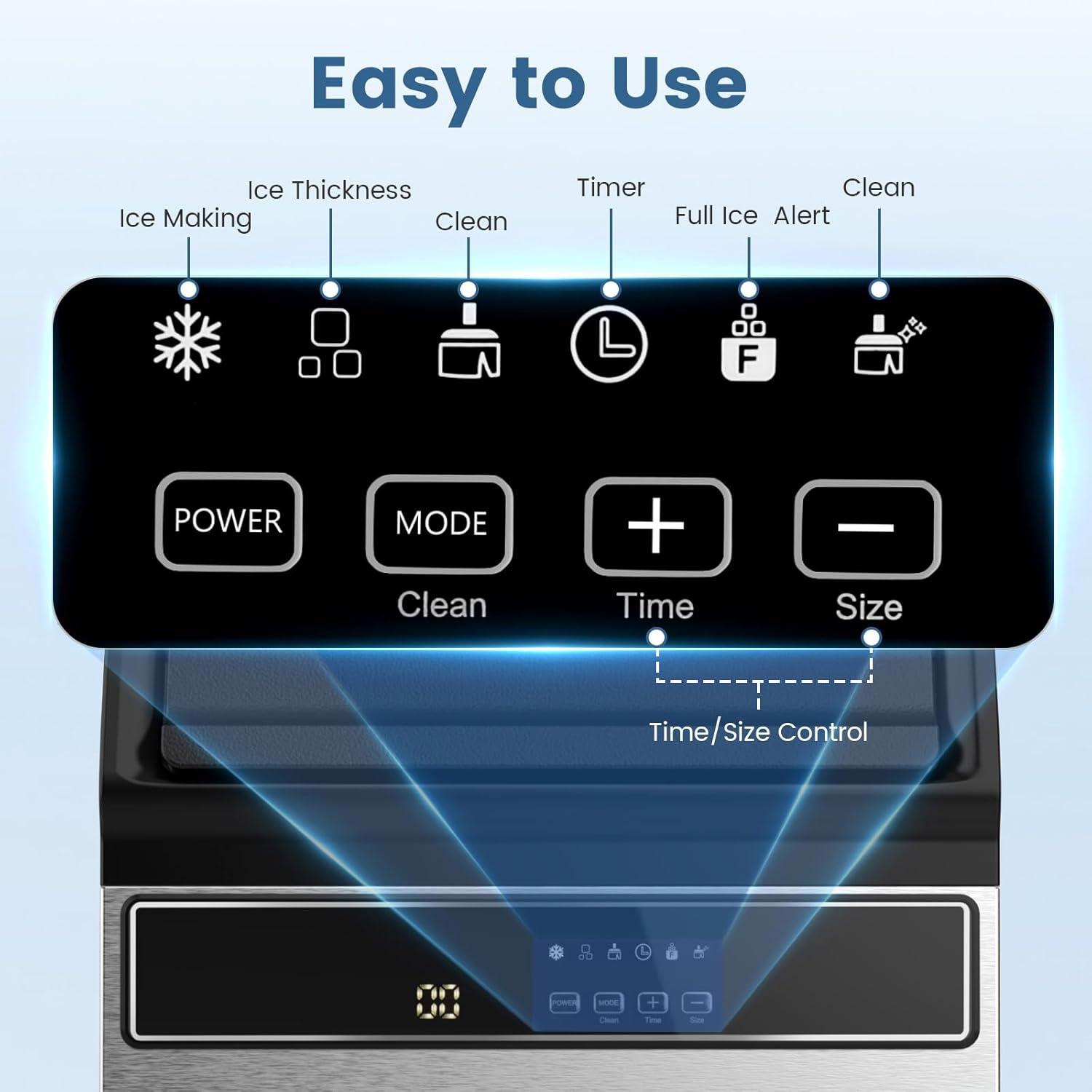 Ice Full Reminder: The under-counter ice maker machine possesses an automatic water supply function. The ice maker machine is connected to a water source facilitates continuous ice production, saving you from frequent water refills and time and effort. When the ice in the ice maker reaches its maximum capacity, it emits a reminder for you to promptly empty the ice maker, preventing ice overflow or wastage, and maintaining the efficient operation of the ice maker.